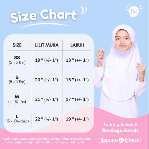 Nota: Cadangan umur yang kita cadangkan adalah cadangan berdasarkan kesesuaian bagi kanak-kanak bersaiz biasa rakan sebaya. Namun jika anak puan sedikit 'chubby', kita galakkan untuk ambil tudung satu saiz lebih besar dari yang kita cadangkan.