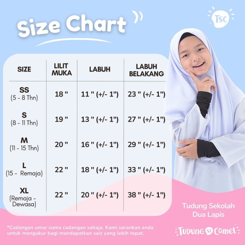 Sesuai untuk Si Comel berusia 9 – 11 tahun (bersaiz badan kecil) Labuh dari dagu 13 inci +/- 1 inci Lilit muka 19 inci Labuh Belakang 27 inci +/- 1 inci